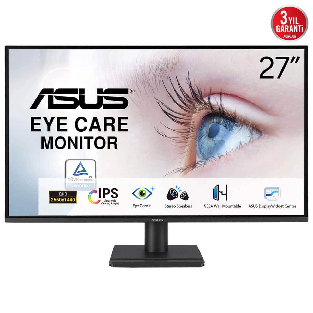 ASUS VA27AQ Eye Care Monitör – 27-inç, IPS, QHD, %99 sRGB, Çerçevesiz Tasarım, HDMI, DisplayPort, VGA, 1ms MPRT, Stereo Hoparlörler, Düşük Mavi Işık, Flicker Free, Duvar Montaj Desteği